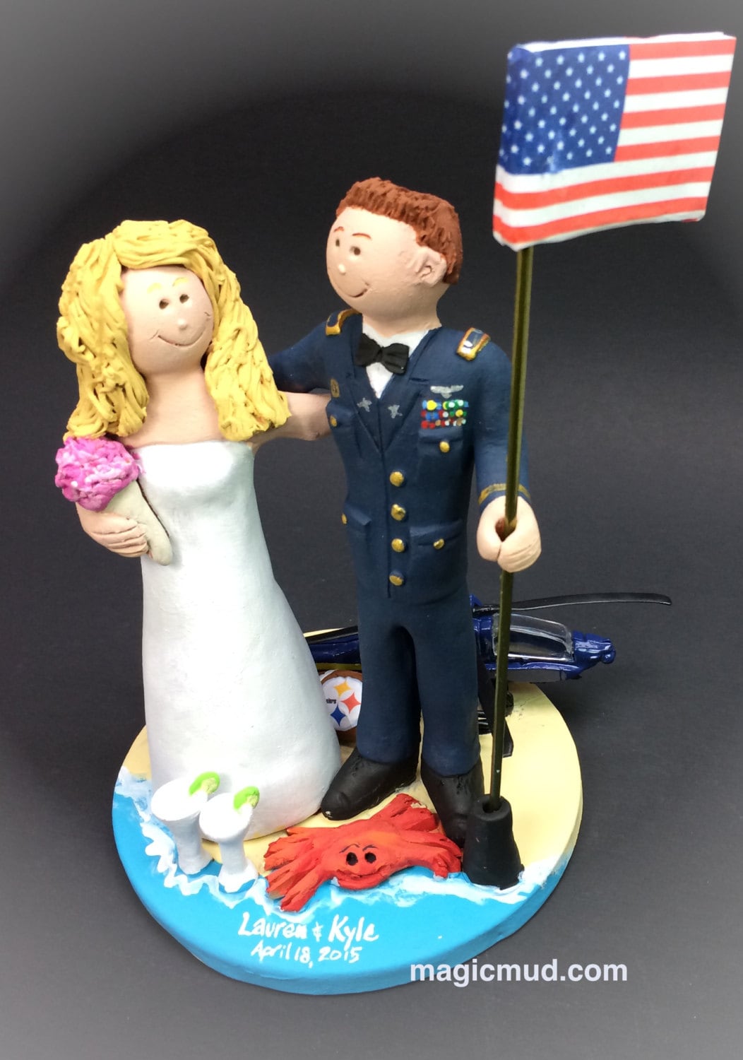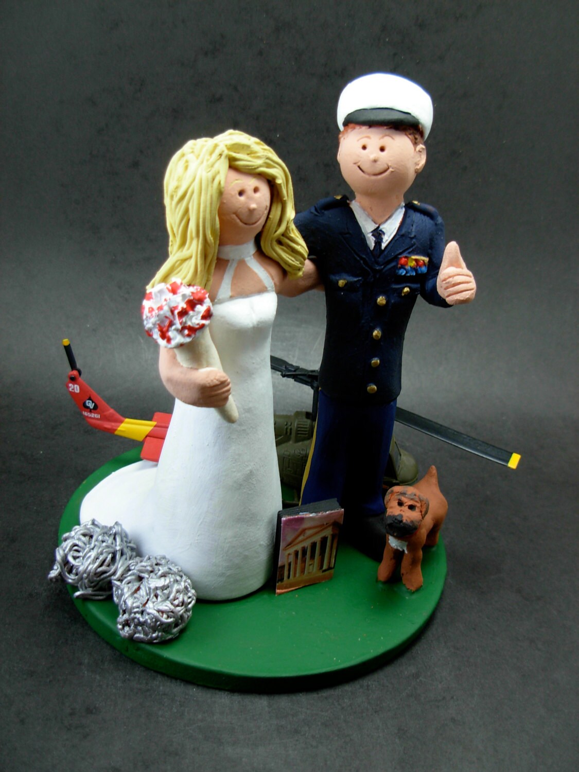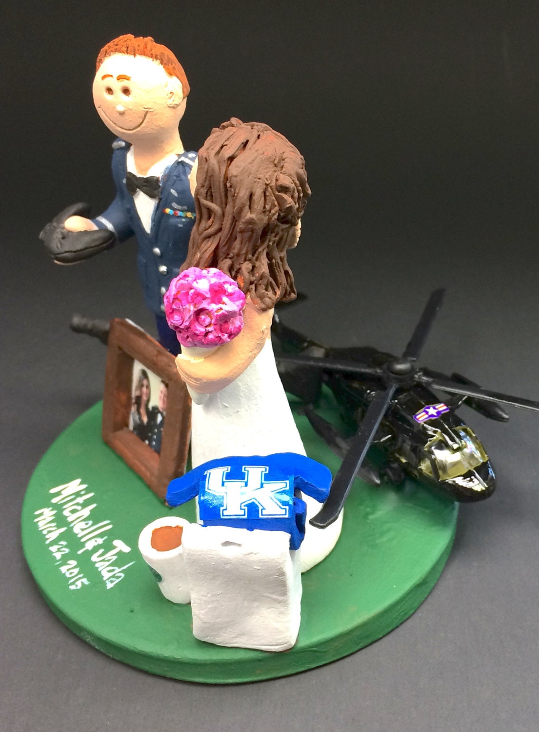 Blackhawk Helicopter Pilot Wedding Cake Topper custom created for you! Perfect for the marriage of a Blackhawk Helicopter pilot Groom and his Bride! This photographed listing is but an example of what we will create for you....simply email or call toll free with your own info and pictures of yourselves, and we will sculpt for you a treasured memory from your wedding!