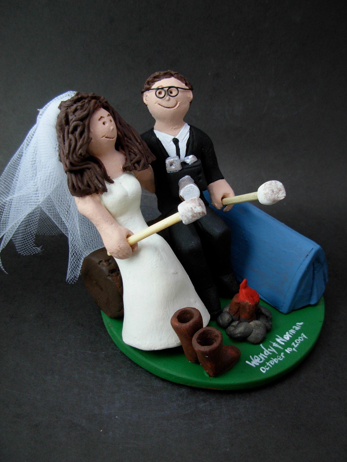 Camping Wedding Cake Topper, custom created for you! Perfect for the marriage of a Camping Groom and his Bride! The photographs in this listing are but an example of what we will create for you....simply email or call toll free with your own info and pictures of yourselves, and we will sculpt for you a treasured memory from your wedding!