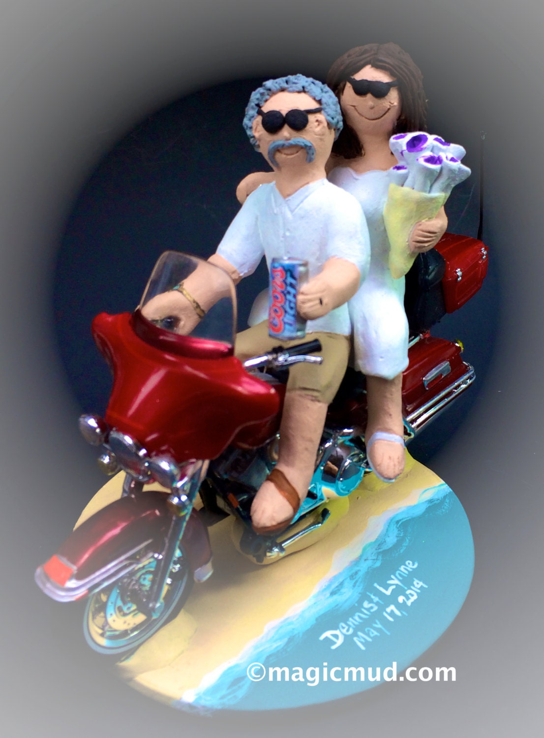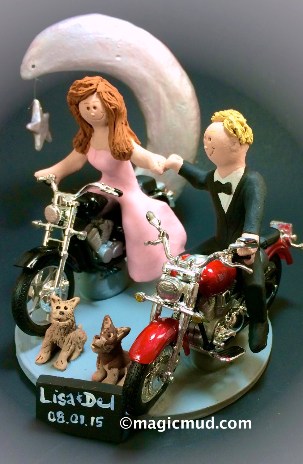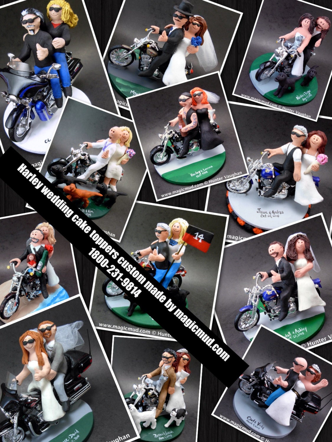 Handmade to your specifications by Hunter, Lois and Jupiter Vaughan of www.magicmud.com a fired clay Harley Davidson Motorcycle Wedding Cake Topper custom created for you! This photographed listing is but an example of what we will create for you....simply email or call us toll free with your own info and pictures of yourselves, and we will sculpt for you a treasured memory from your wedding.