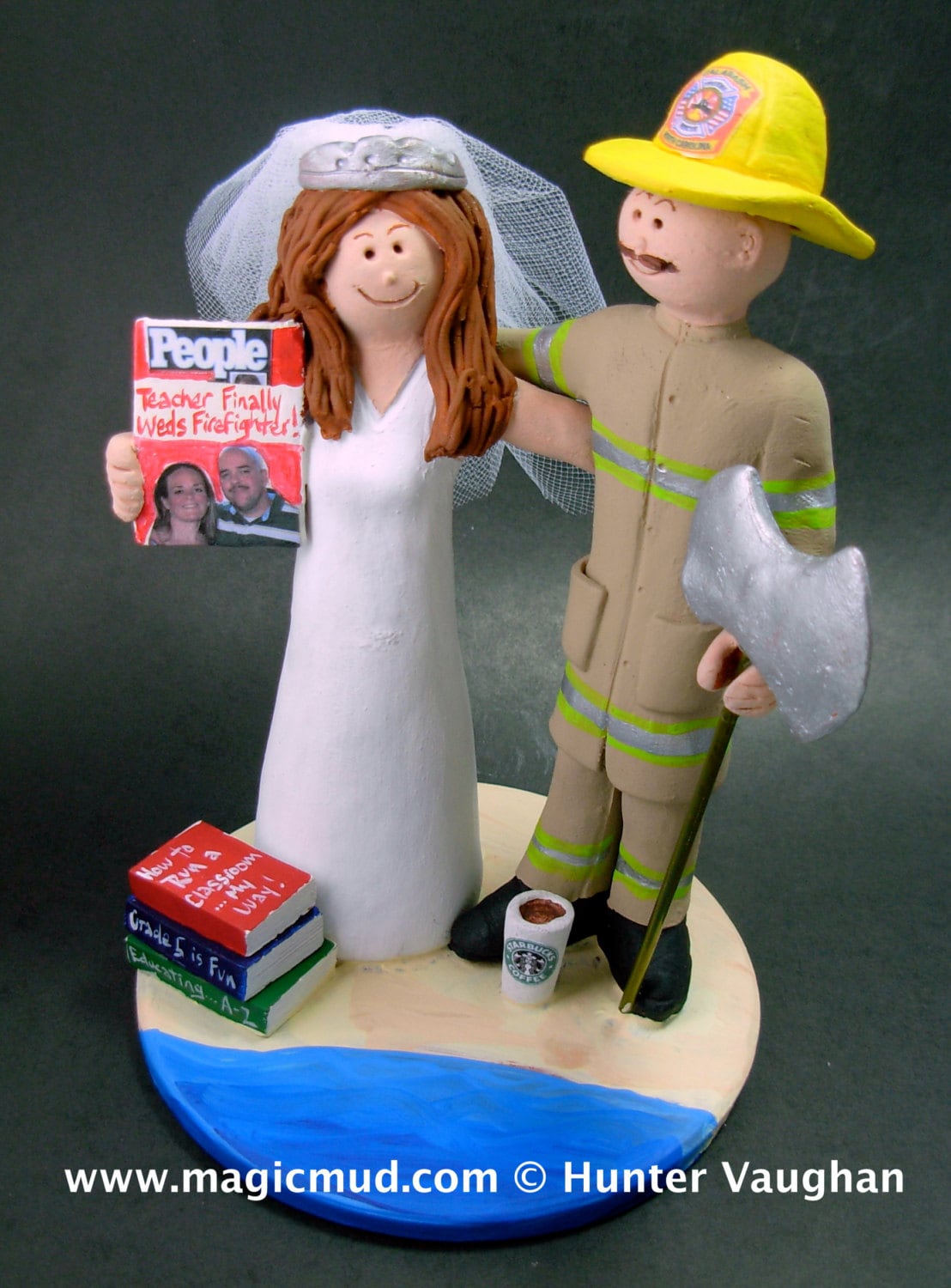 ...a fired clay Wedding Cake Topper for a Fireman or Firefighter, custom created for you! In fireman's uniform, tux, or any combination of clothing,. with fire axe, hose, hat....Handmade to your specifications by Hunter, Jupiter and Lois Vaughan of www.magicmud.com