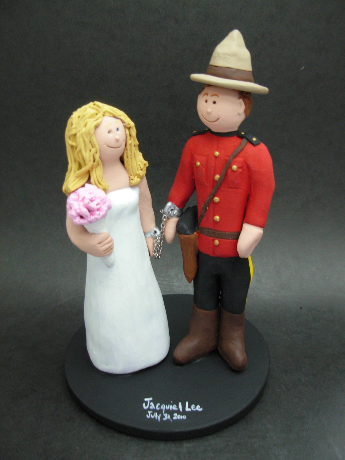Wedding Cake Topper for A RCMP Mounted Policeman, custom created for you! Perfect for the marriage of a Mountie Groom and his Bride! The photographs in this listing are but an example of what we will create for you....simply email or call toll free with your own info and pictures of yourselves, and we will sculpt for you a treasured memory from your wedding!