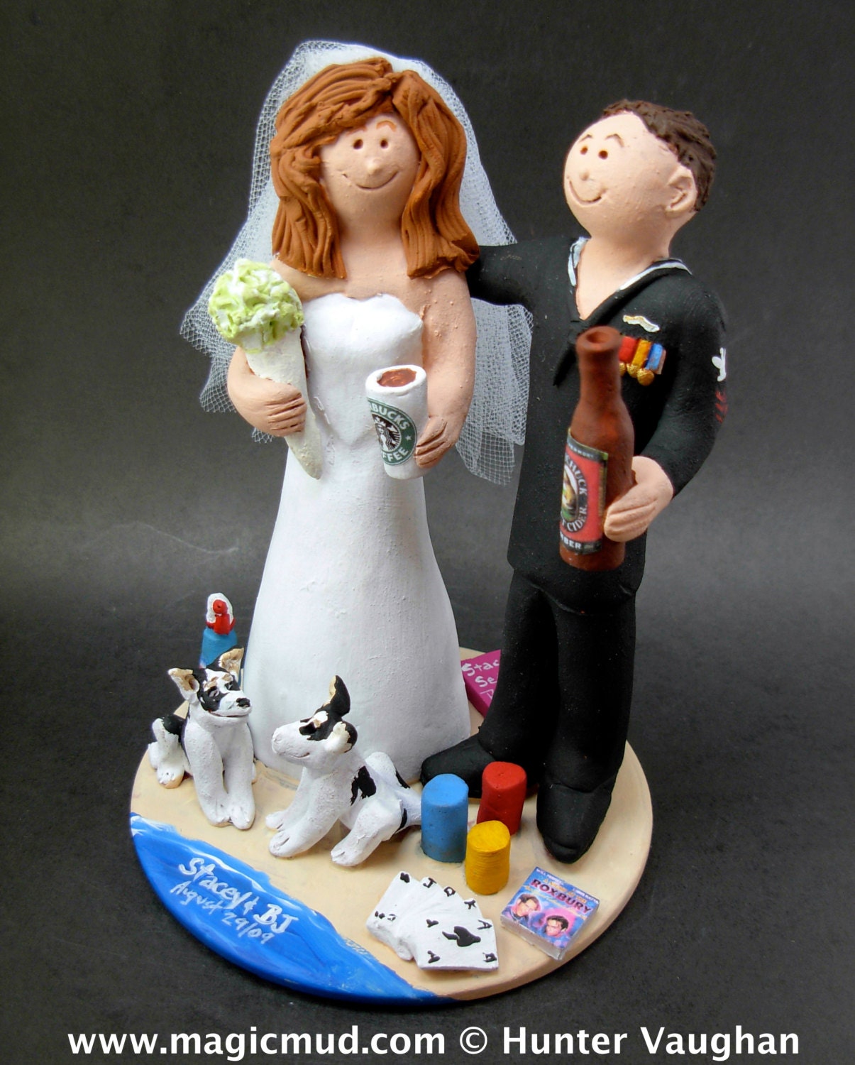 Handmade to your specifications by Hunter, Lois and Jupiter Vaughan of www.magicmud.com a kiln fired clay Military Marine's Wedding Cake Topper custom created just for you! This photographed listing is but an example of what we will create for you....simply email or call me toll free with your own info and pictures of yourselves, and we will sculpt for you a treasured memory from your wedding. call Hunter Contact Us