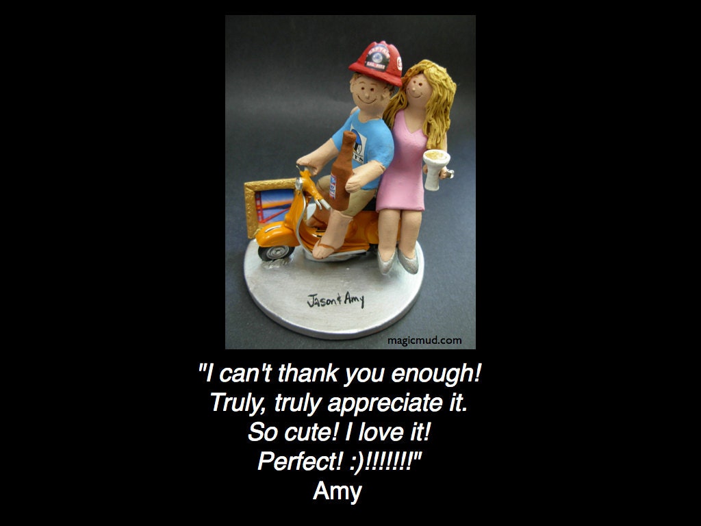 Vespa or Any Scooter Wedding Cake Topper custom created for you! Perfect for the marriage of a Vespa scooter riding Groom and his Bride! The photographs in this listing are but an example of what we will create for you....simply email or call toll free with your own info and pictures of yourselves, and we will sculpt for you a treasured memory from your wedding!