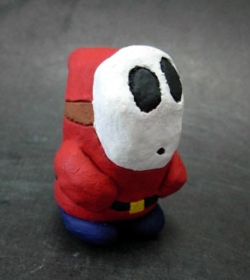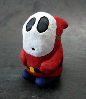This is a Shy Guy, from the Super Mario Bros games. Shy Guys come in all different colours, but this is a standard red one. When I was a kid, Shy Guys didn't really resonate with me in any special way, but a friend of mine liked them and over time I became more fond of the little fellow. Shy Guys have and will do virtually anything, so I could easily make at least a dozen different varieties of them, with spears, submarines, tennis rackets, etc. I could see myself making a few others just to keep him company.....he's shy.