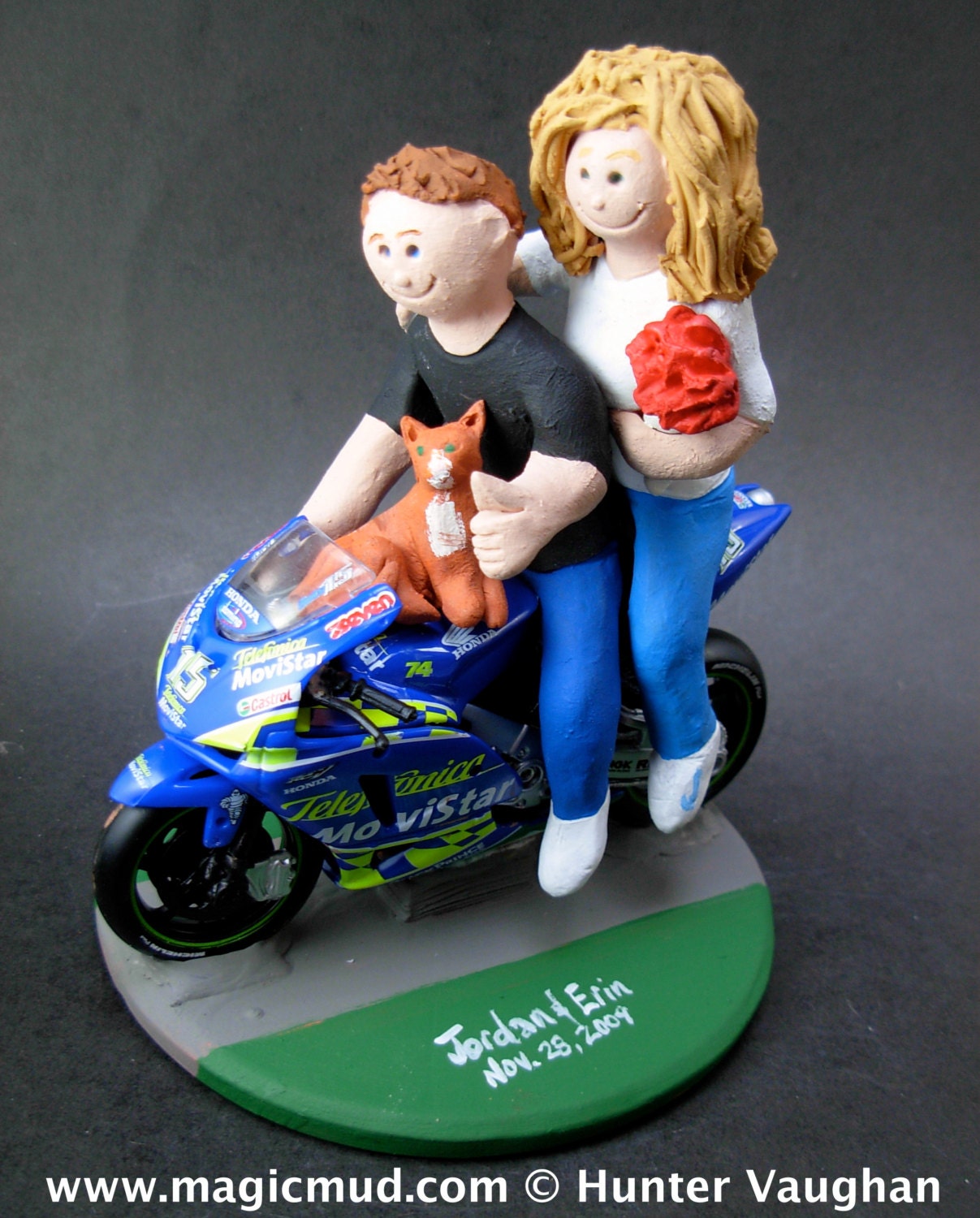 Honda, Suzuki, Kawasaki, Ducati, BMW, Harley, Yamaha or Triumph motorcycle Sportbike Wedding Cake Topper custom created for you! Perfect for the marriage of a motorcycle riding Groom and his Bride! This photographed listing is but an example of what we will create for you....simply email or call toll free with your own info and pictures of yourselves, and we will sculpt for you a treasured memory from your wedding!