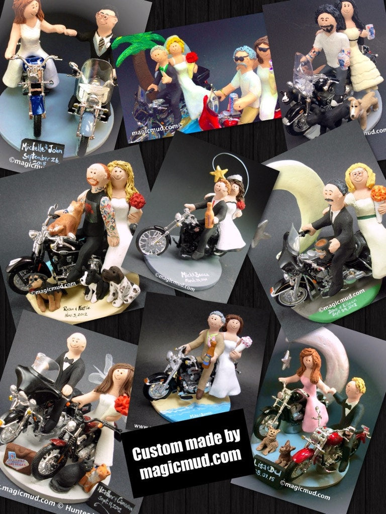 Handmade to your specifications by Hunter, Lois and Jupiter Vaughan of www.magicmud.com a fired clay Harley Davidson Motorcycle Wedding Cake Topper custom created for you! This photographed listing is but an example of what we will create for you....simply email or call us toll free with your own info and pictures of yourselves, and we will sculpt for you a treasured memory from your wedding.