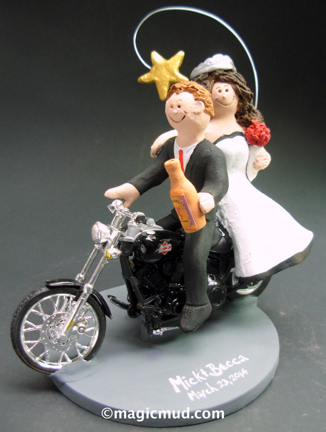 Handmade to your specifications by Hunter, Lois and Jupiter Vaughan of www.magicmud.com a fired clay Harley Davidson Motorcycle Wedding Cake Topper custom created for you! This photographed listing is but an example of what we will create for you....simply email or call us toll free with your own info and pictures of yourselves, and we will sculpt for you a treasured memory from your wedding.