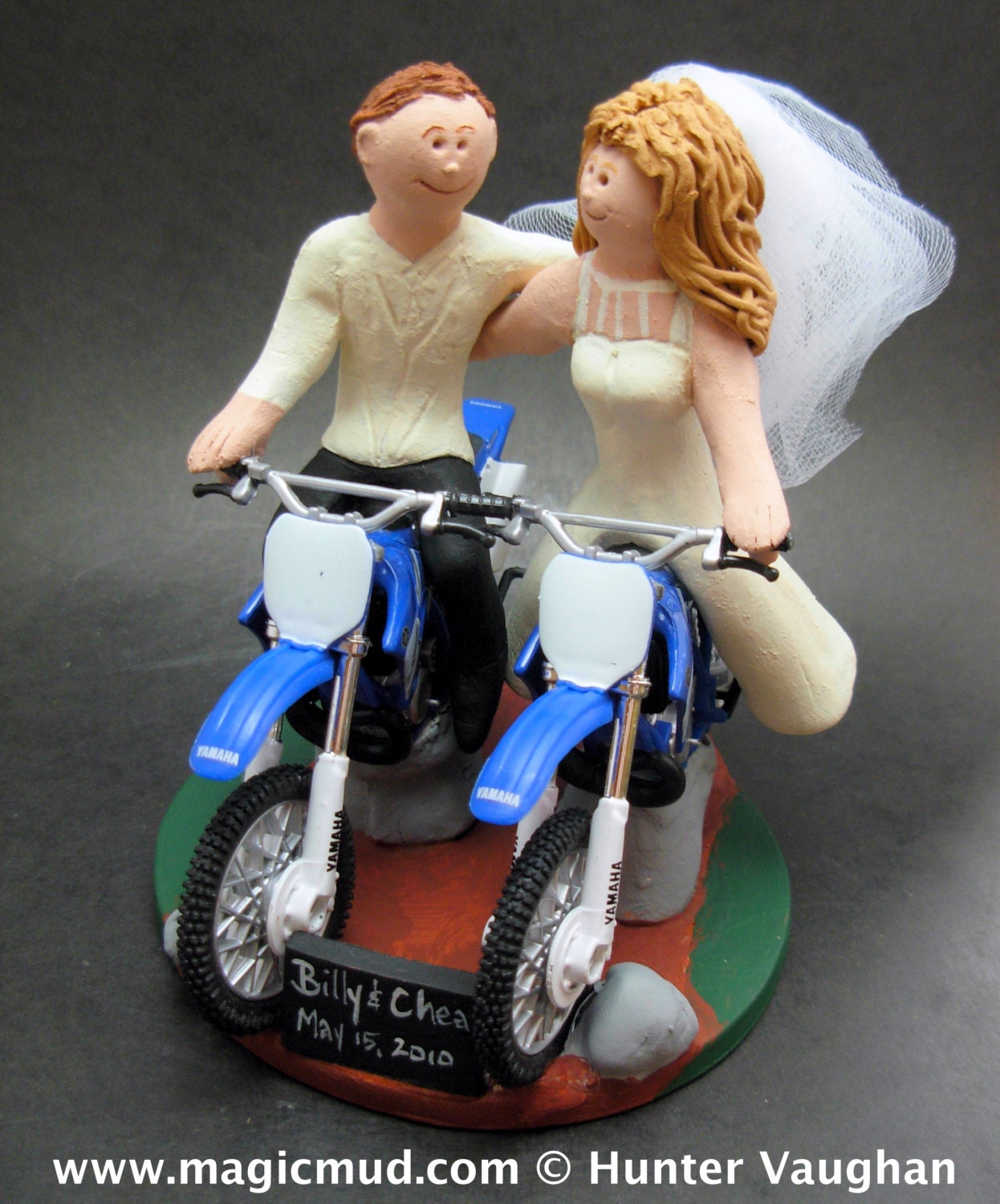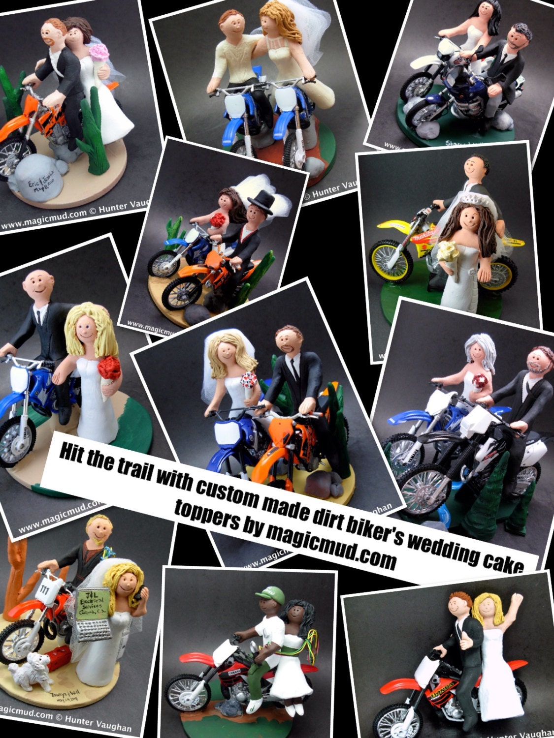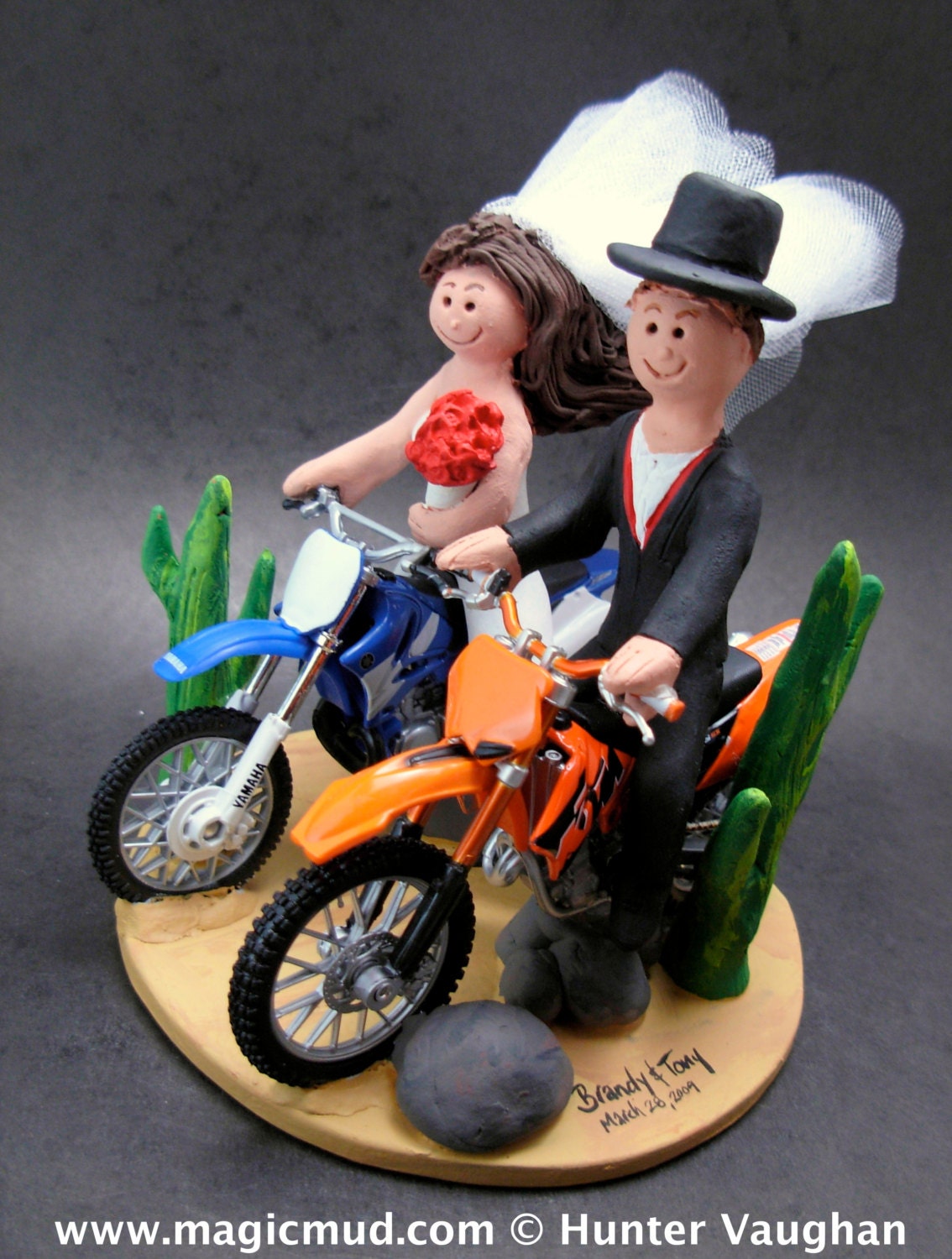 Handmade to your specifications by Hunter, Lois and Jupiter Vaughan of www.magicmud.com a fired clay Dirt Bike Motorcycle Wedding Cake Topper custom created for you! This photographed listing is but an example of what we will create for you....simply email or call me toll free with your own info and pictures of yourselves, and we will sculpt for you a treasured memory from your wedding. call Hunter Contact Us