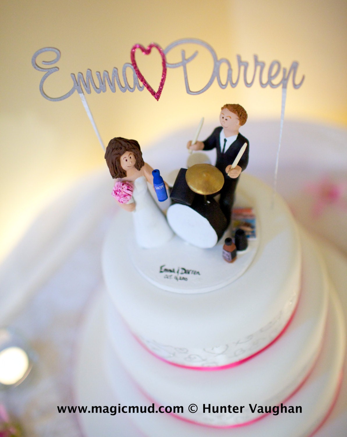 Drumming Groom Wedding Cake Topper, custom created for you! Perfect for the marriage of a Drummer Groom and his Bride! The photographs in this listing are but an example of what we will create for you....simply email or call toll free with your own info and pictures of yourselves, and we will sculpt for you a treasured memory from your wedding!
