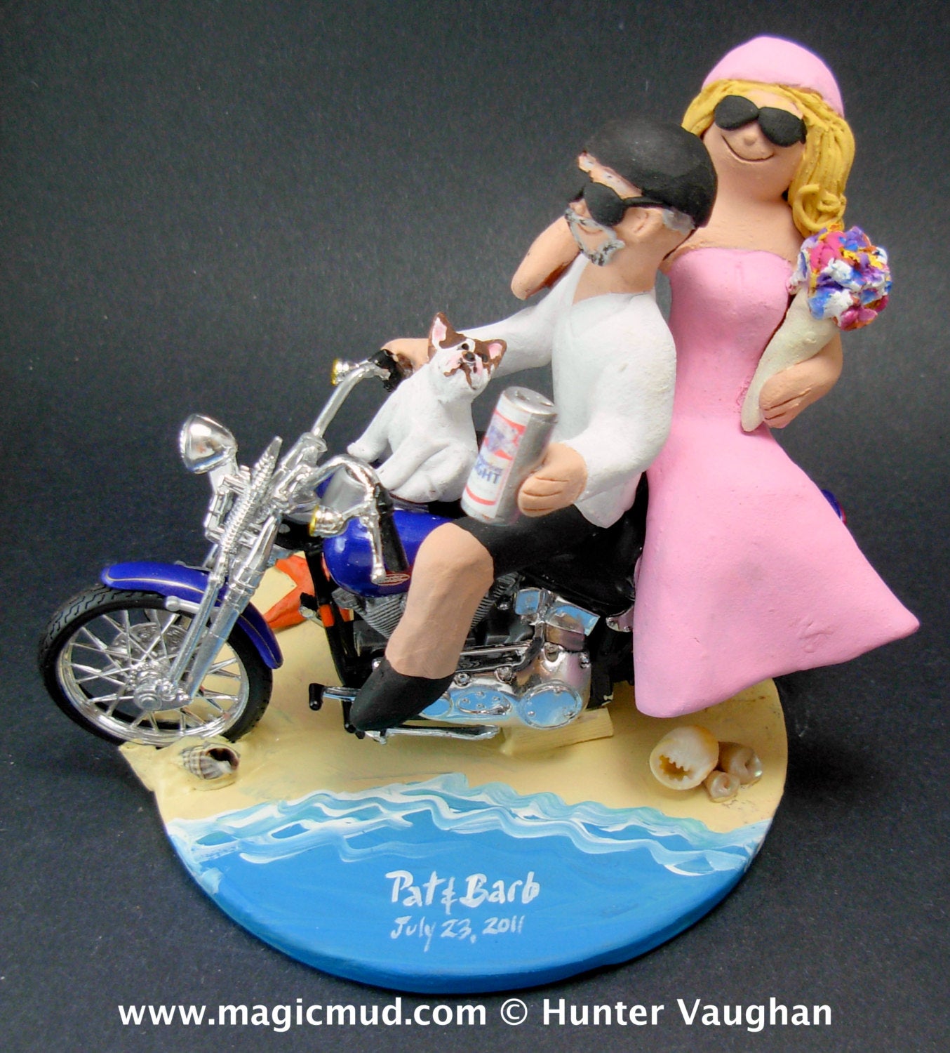 Handmade to your specifications by Hunter, Lois and Jupiter Vaughan of www.magicmud.com a fired clay Harley Davidson Motorcycle Wedding Cake Topper custom created for you! This photographed listing is but an example of what we will create for you....simply email or call us toll free with your own info and pictures of yourselves, and we will sculpt for you a treasured memory from your wedding.
