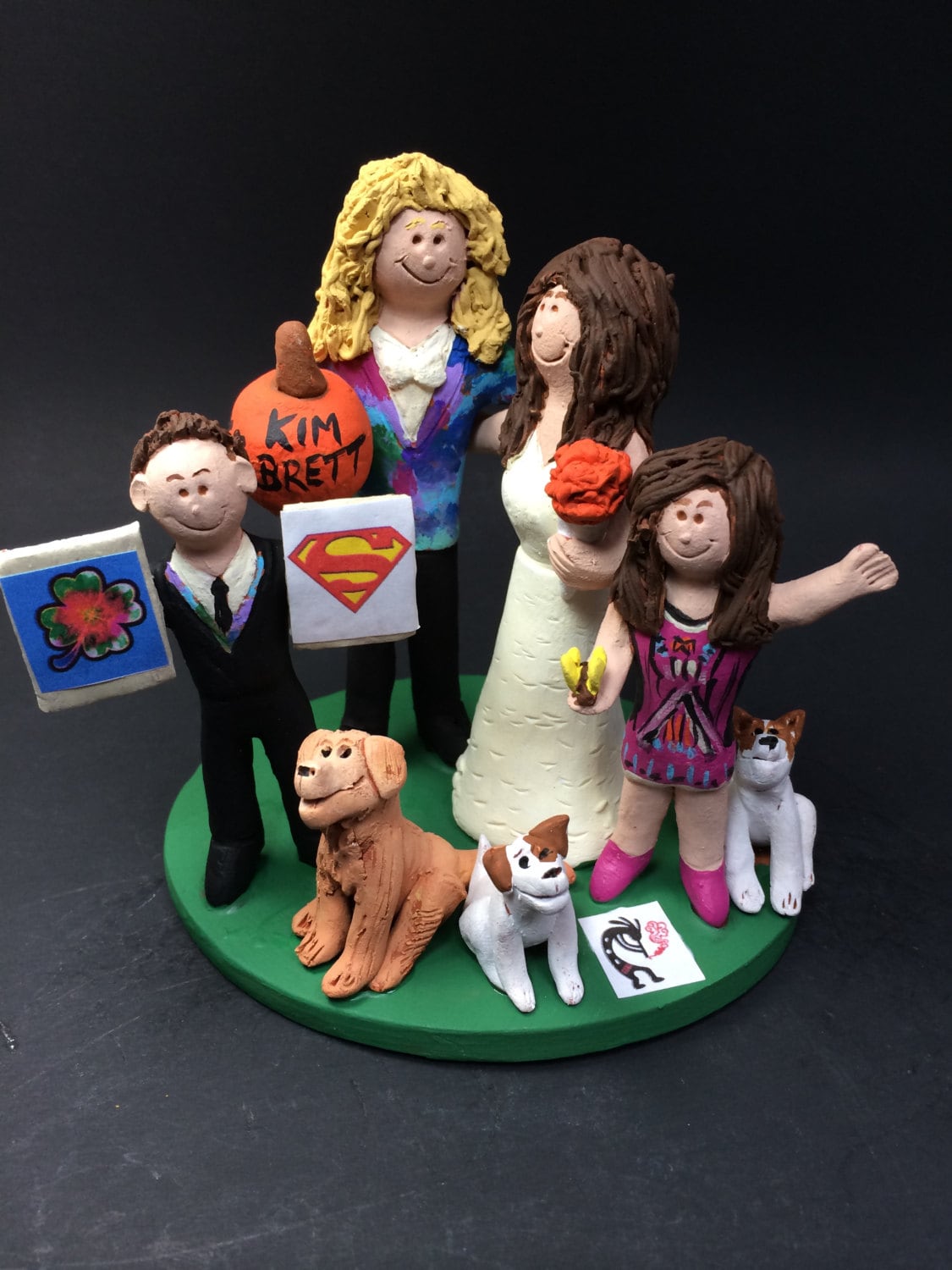 ...a fired clay Wedding Cake Topper for a Blended or Mixed Family, custom created for you! Don't you want to include the kids in your wedding cake topper? Handmade to your specifications by Hunter, Jupiter and Lois Vaughan of www.magicmud.com