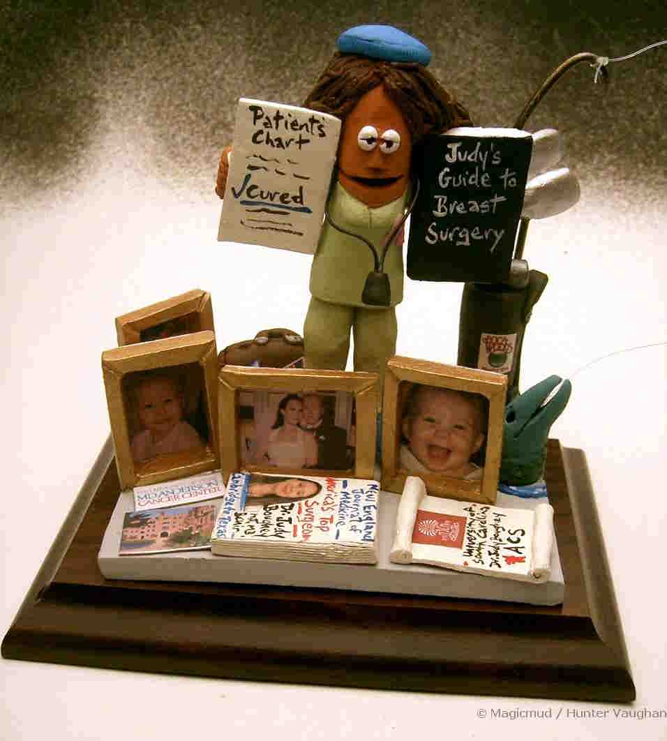 Personalized gift for a female Surgeon....a custom made caly caricature of the Doctor, with pictures of Her Family in the background